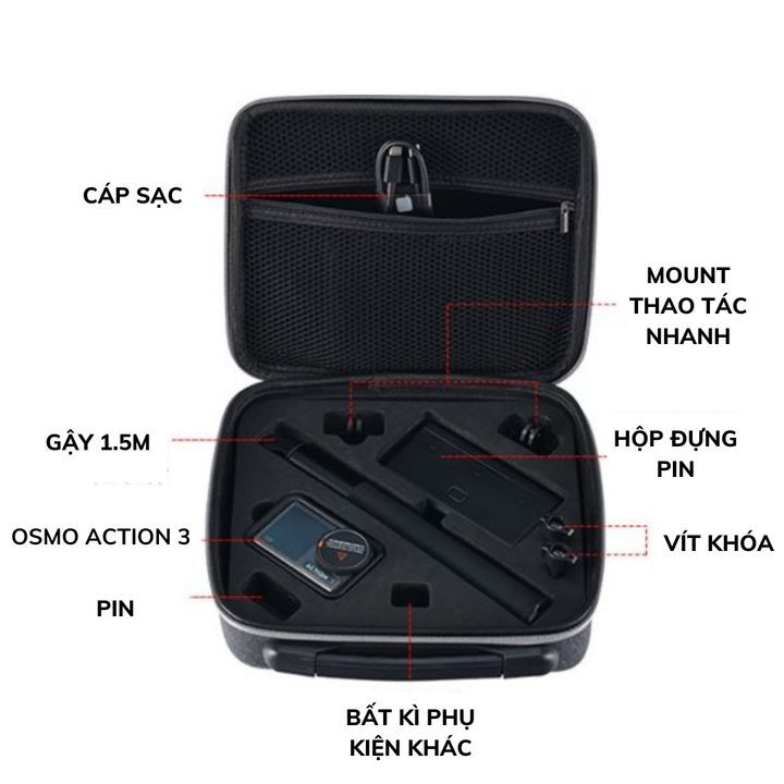 Sản phẩm được thiết kế với kiểu dáng nhỏ gọn nhưng lại cực kỳ khoa học và tiện dụng. Kích thước tiêu chuẩn 20x22x9 cm đủ để chứa đầy đủ các phụ kiện cần thiết như máy quay Osmo Action, gậy selfie, pin dự phòng, mount thao tác nhanh, bộ sạc, thẻ nhớ hay micro thu âm. Tuy nhỏ nhưng từng khoang chứa bên trong đều được bố trí hợp lý, ôm sát từng thiết bị nhằm tránh tình trạng xô lệch hay va chạm trong quá trình di chuyển. Trọng lượng chỉ 400 gram giúp việc mang theo sản phẩm trở nên nhẹ nhàng, không gây cồng kềnh hay vướng víu, dù bạn bỏ túi trong balo, vali hay xách tay khi cần linh hoạt.